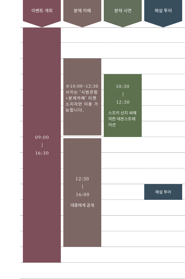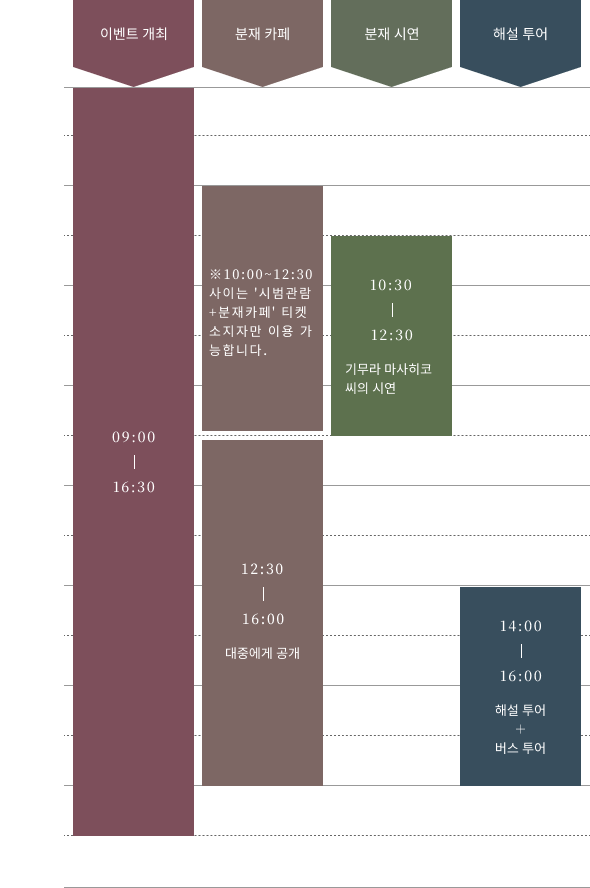 ※ 11/22일(금), 23일(토), 24일(일), 10:30~12:30 사이는 '시범관람+분재카페' 티켓 소지자만 이용 가능합니다.
